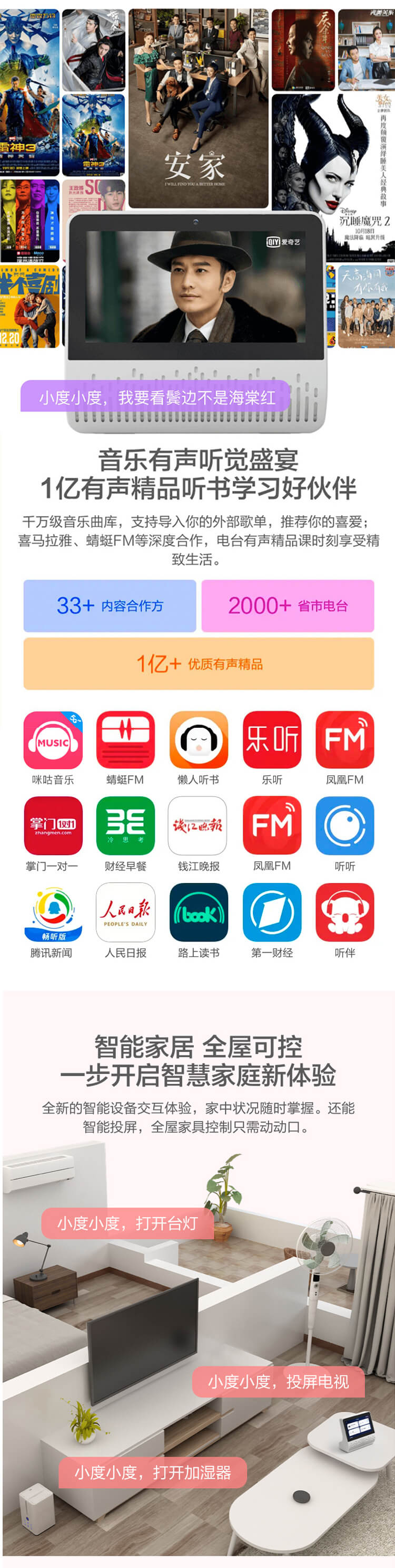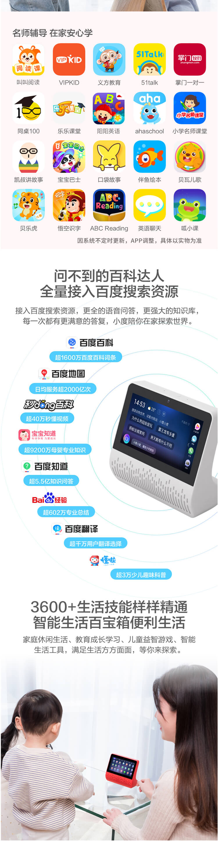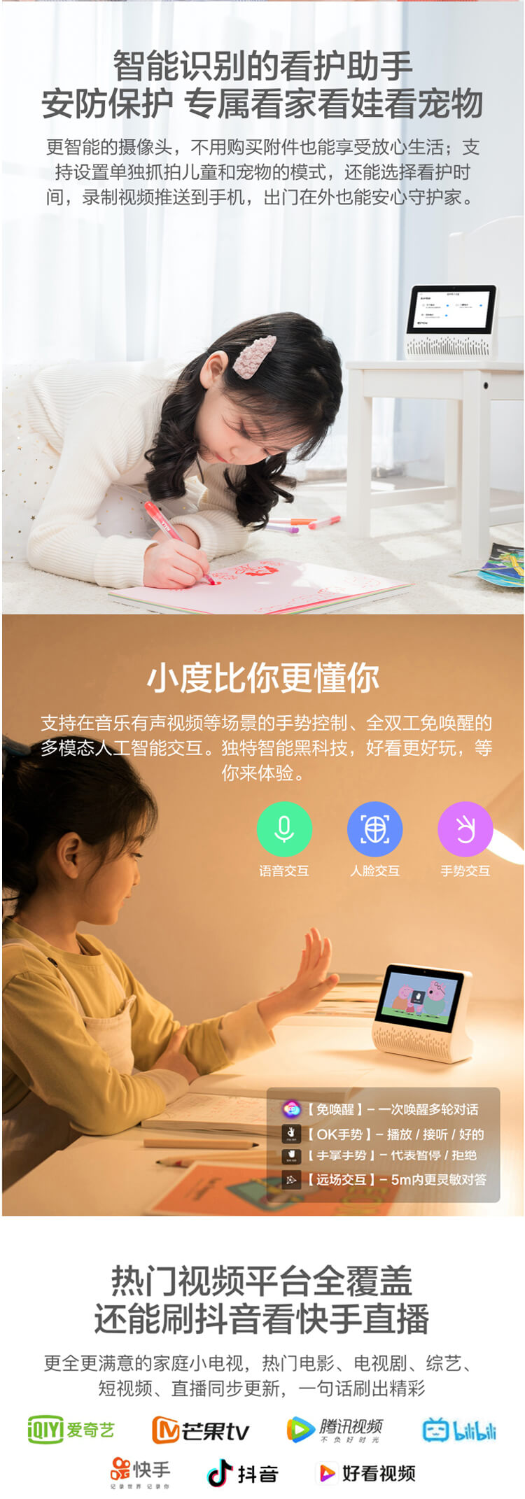 小度在家智能屏是百度公司旗下产品,拥有家庭全场景多维度覆盖、丰富全面的内容服务资源和超强学习陪伴能力.