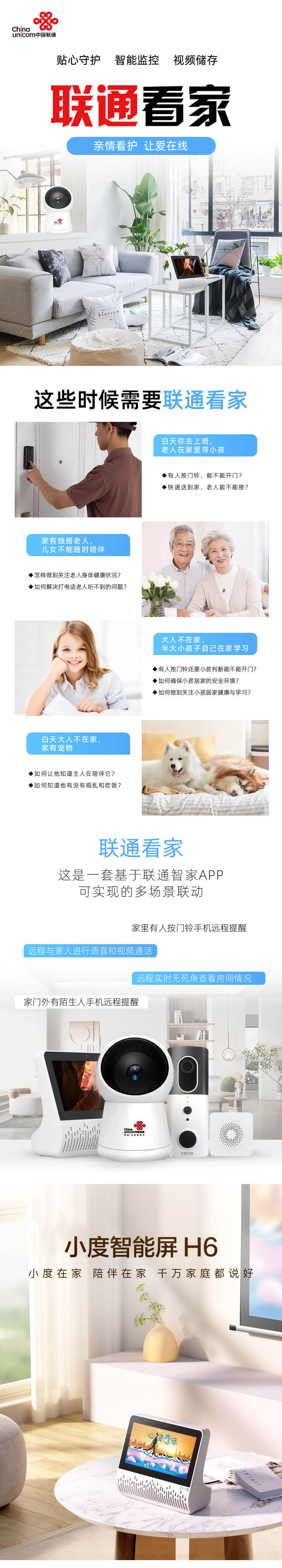 看家套餐--适用于职场人士看护家中老人与孩子 职场人上班赚钱,留下老人和孩子在家中,总担着放不下的心。 智能看家套餐老人与孩子居家生活场景中,所有需要帮助的场景,兼顾了可视化、便捷、安全等要素。